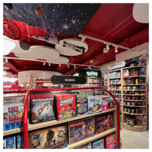Il colore rosso, identità del marchio, aggiunge vitalità, mentre il legno contribuisce a creare un’atmosfera accogliente. La disposizione degli articoli, l’utilizzo sapiente del colore oro e l’illuminazione sono stati pensati e organizzati per stimolare l’interesse e suscitare meraviglia di grandi e piccini.